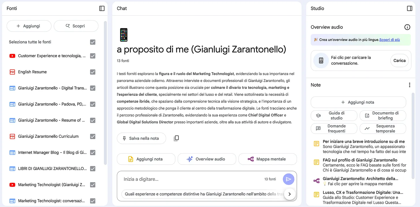 Con un account Google potete dialogare con una pagina pubblica di Notebook LLM dove ho messo a disposizione tutti i miei contenuti del blog, del mio sito, di interviste e molto altro.